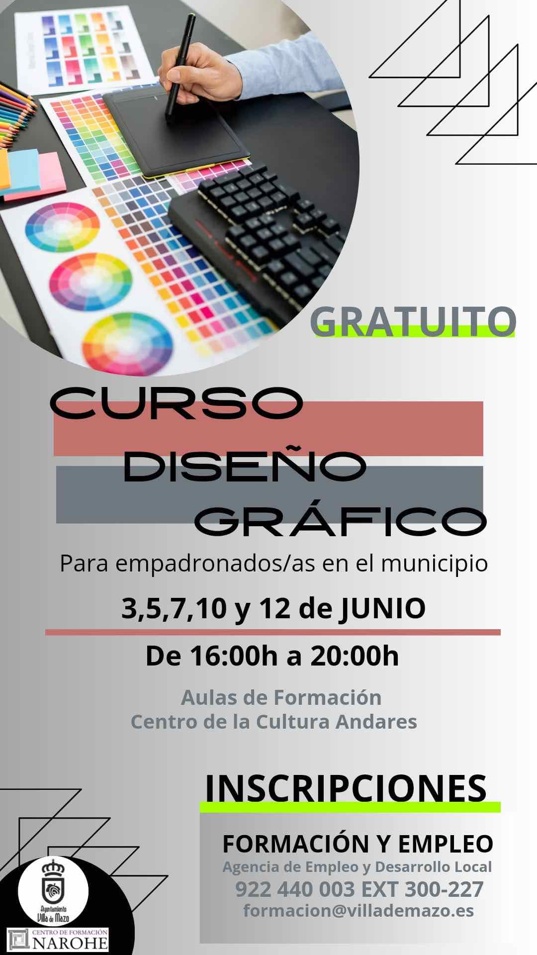 El Ayuntamiento de Villa de Mazo continúa con su programa de formación gratuita para los empadronados en el municipio. En esta ocasión, se ofrece un curso de diseño gráfico que se desarrollará los días 3, 5, 7, 10 y 12 de junio, de 16:00 a 20:00 horas, en las aulas de formación del Centro de la Cultura Andares.